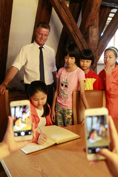团员们依次在城市备忘录上留下自己的姓名,帅气的市长与每一位同学合影留念。