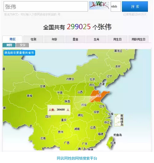 2014年高居重名排行榜第一的,没错,是张伟。全国共有约29.9万个张伟,而冰岛整个国家人口也才32.56万人。每个人的生命中恐怕都有几个张伟经过。除了张伟,王伟、李娜、张敏、李静都不负众望地位居前列,扫一眼重名排行榜,满是熟人。