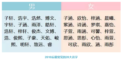 2010年以后出生的男童十个最常见的名字为“子轩”、“浩宇”、“浩然”、“博文”、“宇轩”、“子涵”、“雨泽”、“皓轩”、“浩轩”、“梓轩”。而在21世纪00年代,十大俗名则为“涛”、“浩”、“鑫”、“杰”、“俊杰”、“磊”、“宇”、“鹏”、“帅”、“超”。竟然无一进入10后十大俗名,表现最好的“俊杰”也不过能排行十一而已。