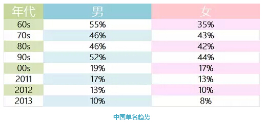 但到了00后,情况发生了重大变化,男性单名率暴跌到了19%,女性更是掉到了17%。这个趋势至今仍在发展——13年出生的男性单名率只剩10%,女性已经不足一成,为8%。