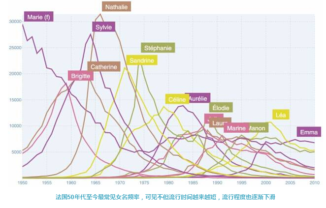 比起当年一个Mary就占去24%人口的盛况,当今英国最流行的女名也不过能占到出生人口的4%。而流行名字更新的速度也越来越快——美国和法国的姓名流行期都越来越短,人们喜新厌旧的习气越来越重。