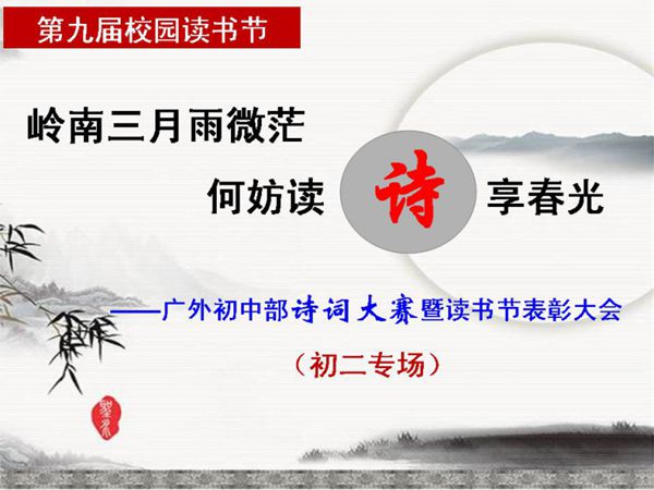 “华夏文明,璀璨夺目。诗词歌赋,熠熠生辉。”为传承中华经典文化,提高同学们对古典诗词的感受能力与鉴赏能力,4月12日上午,初二年级语文组承办的“岭南三月雨微茫,何妨读诗享春光”诗词大赛暨读书节表彰大会在黄华楼举行。