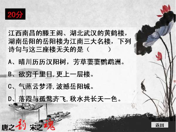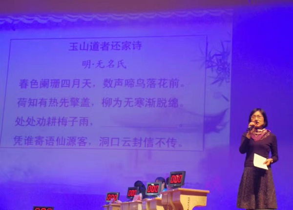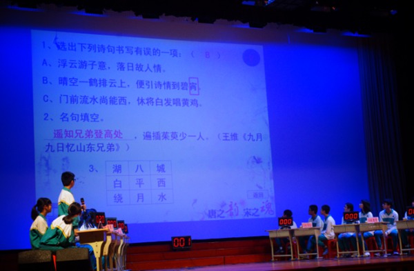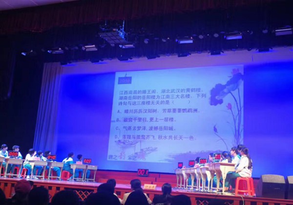 “【1】他是一位唐朝的山水诗人……”主持人话音刚落,便有选手眼疾手快地按下了抢答键。“我的答案是:王维。”选手坚定地回答出来。“回答正确!”随着主持人的宣布,台下掌声雷动。各组也开始抓紧机会抢答,使出浑身解数,争分夺秒地答题,赢得了一阵有一阵的掌声。时间一分一秒地过去,16班的选手们以过人的胆色与深厚的诗词功底夺得了80分!而有些组的得分仍停留在鲜红的大大的“0”,台下的观众不禁也为选手们捏了把汗。