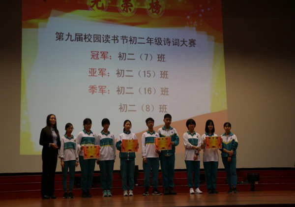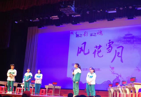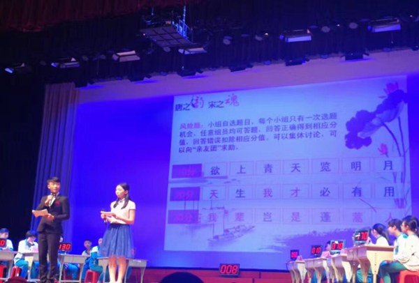 只见,7班和15班三名选手,低头沉思,准备迎战,要求从“风、花、雪、月”中任选一字。现场近千名观众屏住呼吸,前两句关于“花”和“月”诗句,选手分别答出了十多句,两班各胜一局。决胜局,7班选手依旧波澜不惊,从容应战,战胜对手,最后,7班荣登冠军宝座。