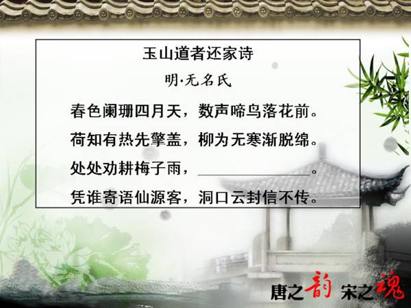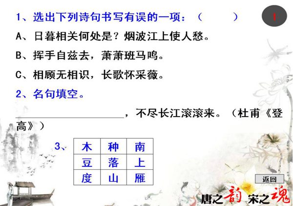 ◆个人必答:小组成员轮流回答一道题 (诗句书写正误选择题、填写上句、九宫格 ), 必须由本人回答,每答对一道得10分,共30分。其他成员提醒视为作弊,每道题作答限时20秒。