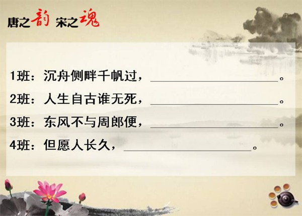 选手们集思广益,利用自己对诗词知识的积累,纷纷给出自己的答案,特邀嘉宾miss任书屋的主人任丽萍老师现场点评,最终7班以“家家唤饮杏花茶”的诗句,工整对仗,获得本轮比赛最高分,顺利晋级。15班以“家家欲捕池塘蛙”位居第二,晋级。另外16班、8班以微小之差止步于此,并列获得本次诗词大赛第三名。