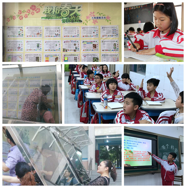 记录作品过程中,孩子们遵照各学科老师们的指导要求奋笔疾书,认认真真书写,细细致致填涂,明明白白领悟。在这短短的时间里,各班的作品陆续呈现眼前,纵观这些作品,都能围绕“我和春天有个约会”这个主题和依照年级要求完成。在展板中,一幅幅娟秀大气的文字,一篇篇稚嫩精巧的作品,不仅体现出三年级小朋友对春天的喜爱,更多是对幸福生活的美丽向往和对充满梦想与希望的童年的独特理解。总之,那小小展板上呈现的却是无穷尽的少年生活。