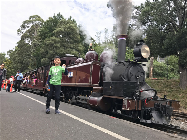 墨尔本的第三站,我看到了澳大利亚最古老的东西,它就是普芬比利蒸汽火车,它可不普通,可是澳洲第一条火车铁路哟!我们坐上了蒸汽小火车,好玩的是我们可以坐在车厢边上,把脚丫荡在外面呢!我得提醒一下,坐蒸汽火车时记得穿雨衣哦,否则下车时,你会带回来一身煤渣子!哈哈!