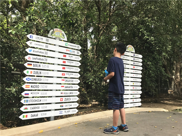 最后一天,我们来到了澳大利亚的龙柏考拉野生动物园,在那里,可以抱考拉哦!进了大门,我看见一块里程牌,上面标记着从布里斯班到世界各地的里程,我仔细地看,找到了广州,当看到的时候,我特别惊讶,原来广州离布里斯班大约有7500公里远,真的不能再远了!