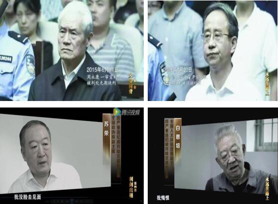 “错不在官场,错不在商场,错在自己。”河北省委原书记周本顺说。“人生都是现场直播,没有办法重来,而每个人都得为自己的行为负责,这是亘古不变的。”四川省委原副书记李春城说。“我家‘于姐’成了江西权钱交易的代名词,家教上我是一个不称职的父亲,不称职的丈夫。”十二届全国政协原副主席苏荣说。“我自己腐败了,但是我非常期盼中央能够加大反腐败的力度。”全国人大环资委原副主任白恩培说。