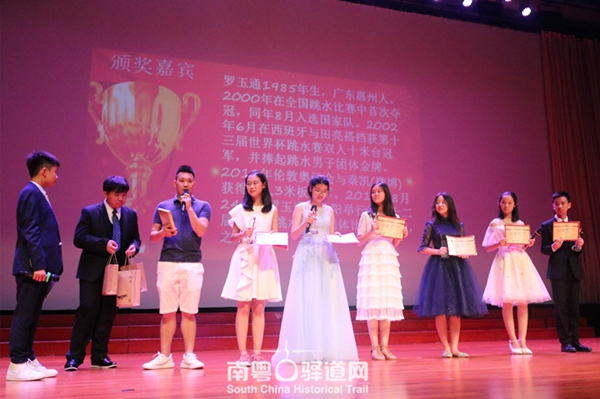 罗玉通为广外外校的“青春之星”颁奖,并手持《古音峥嵘——中国南粤古驿道古曲复活工程》CD向广大师生们介绍、宣传南粤古驿道。
