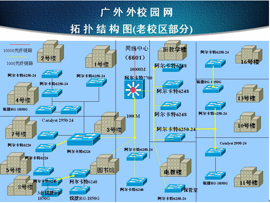 广外附设外语学校网络接入级数过多,比如教工饭堂到小学高教楼汇聚机房中间经过教工9栋、教工8栋,图书馆4级,教工6栋和16栋中间经过教工5栋、教工3栋2级接入到小学高教楼汇聚机房。