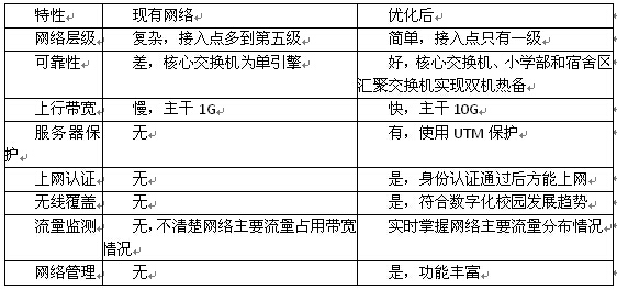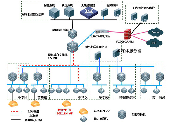 1.调整、优化网络结构,减少网络层次,减少故障点。通过将学校网络划分为中学部、小学部、财务室、服务器区、黄华楼、多媒体课室与宿舍区七大部分,实行不同安全策略等级和不同的流量策略;网络架构采用核心+汇聚+接入三层架构,二、三、四、五级接入点全部通过新布设的光纤直接接入到核心或汇聚节点,成为一级接入点。