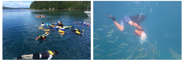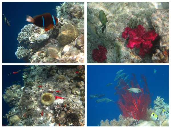 大断层的地质构造奇特,珊瑚区离水面一两米,而珊瑚礁边沿则直下数百上千米,不见其底。此处珊瑚更好看,鱼类更丰富。磨磨蹭蹭正想不穿救生衣下水,被导游阻止。无奈,穿上救生衣。一眼望去,大群浮潜者跟着导游,浮在水面上,脸朝下,露出呼吸管,像以一种奇怪的姿势开会,场面有点小滑稽。