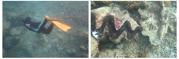 干贝城充分满足了我下潜的愿望。据说这里有百岁高龄的砗磲贝,直径超过一米,生活在数米深的浅海海底。见过用砗磲贝做的饰物,没见过活的砗磲贝,作为贝类软体动物,有坚硬的外壳,是不是比沙滩上的贝壳大几千上万倍?在导游的带领下,游向大砗磲的巢穴。海面有缓慢的流速,幸好有缆绳固定在这个区域,好几位勇敢者已经下潜了一两个来回,我匆忙脱掉救生衣,扔给同伴,交待帮忙拍几个下潜镜头,就一头扎进不深的海底。二三米的深度,潜下去比较轻松,开始时位置不对,潜下去后,一片珊瑚枝,光线没有大断层那么好,珊瑚的色彩较为暗淡,用手碰了一下,硬硬的,回到水面喘口气。出水面时发现同伴不见了,大声呼喊,在众多浮潜者中找到了,原来他也在找我。洋流虽慢,力道不小,于是更加羡慕科斯特纳有鳃和蹼。深吸一口,钻进水里,朝一个巨大咖啡色软体物游过去,果然是大砗磲,像一朵肥大无比的半开的花,肉乎乎的,是不是在欣赏上方探头探脑的人类?不对,它是没有眼睛的。再潜下去一点,近了,手指一碰,凉飕飕,滑溜溜,软体猛然收缩了一下,是活的,而且反应灵敏。这真是一件好玩的事,对大砗磲来说是个恶作剧,恶作剧属于童心范畴,埋藏了几十年的这颗童心被激活。出水问同伴,拍到没?同伴说,没拍到。好,再来。示意好下潜位置,我深吸几口气,扎进水里,水母服减轻了摩擦力,迅速潜到海底,往一个褐色蓝点的砗磲游去,洋流阻力之下,我攀着一块珊瑚礁爬过去,肺活量储存不多了,憋住,终于摸到了这个大家伙,同样凉飕飕,滑溜溜,软体猛然收缩一下,看来,砗磲们不欢迎人类用这种方式接触它们。感觉同伴拍照成功了,迅速冲出水面喘气。