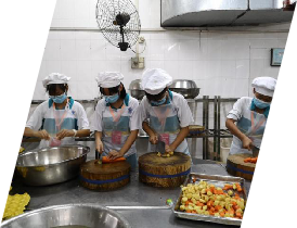 到了食堂后厨,看到一个个蹲着、站着,戴着口罩、帽子和围裙,差不多认不出谁是学生谁是厨房工人。这个点正是准备午餐的摘、剥、洗、切最繁忙的时候,有的在砧板前切菜、有的猫着腰在认真的打鸡蛋、有的在削土豆、有的在帮忙冲洗青菜…