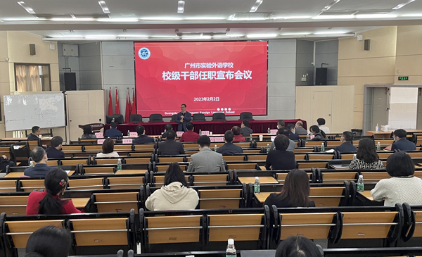 2月2日,广州市实验外语学校召开校级干部任职宣布会议。学校中层以上领导干部参加会议。广东外语外贸大学副校长刘建达,广外教育合作发展中心主任、党委书记孙远雷出席会议。会议由广外教育合作发展中心副主任余海波主持。