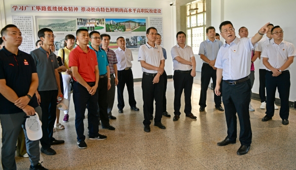 随后全体党员来到广东松山职业技术学院开展党史学习教育交流,松山职业技术学院党委书记方迎生、党委副书记张林茂出席座谈会。方迎生介绍了松山职业技术学院的历史沿革、办学特色、人才培养、党建工作等方面的基本情况以及近几年来学校所取得的成绩,并分享了该校开展党史学习教育的经验。他还带领大家参观了该校工业机器人装调与维修实训室、机电一体化实训室、DNC数字化工厂、数控车间、精密检测及逆向工程实训室等教学场所。