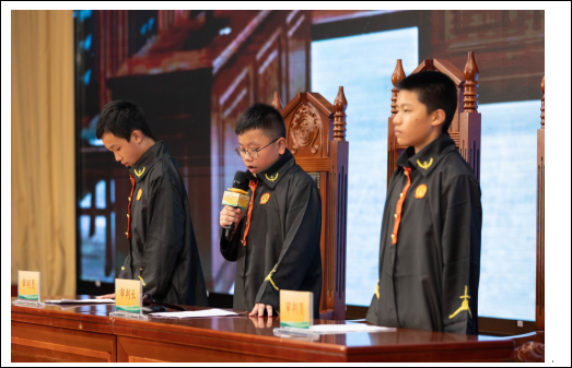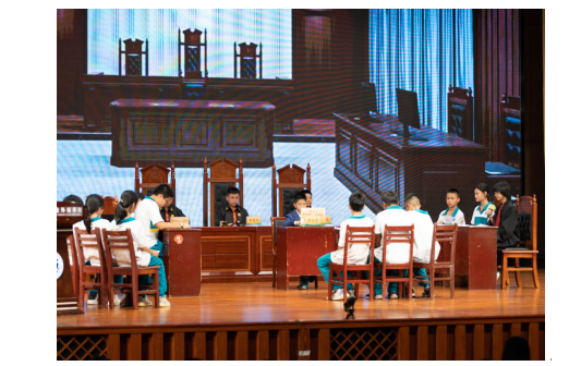 学生最期待、最激动人心的项目---模拟法庭正式开始。开庭之前,学生们表演了该案件的发生情况。一名未成年人因为中午吃饭排队问题与同学发生口角和冲突,于是纠集他人对该同学进行报复并用尖刀刺伤对方,造成对方重伤的案件。孩子们表演的栩栩如生,仿佛把场下学生观众带入到“真实情景”之中。接着模拟法庭正式开庭,学生们精心打扮成原告、被告、辩护律师、法官等角色的形象并穿着正装出场,展现出专业的法庭风范。原告和被告各自呈交了书面证据和陈述,辩护律师们展开了激烈而严谨的辩论,不时引起观众们的掌声和喝彩。