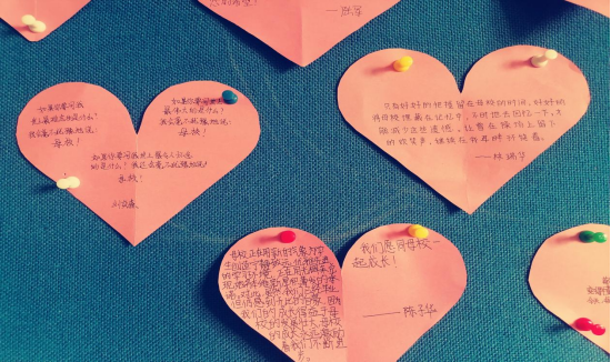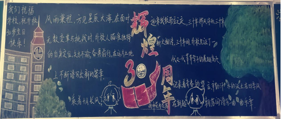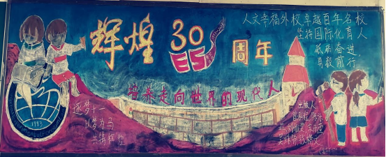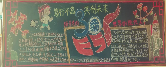有的班级克服了黑板报的困难,积极用多样的途径来表达对校庆三十周年的情谊。例如初三(2)班、初三(14)班的同学们积极利用手工作品装饰黑板,并且为校庆三十周年写出了自己的心里话,充分表达了同学们对学校的深情。