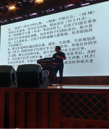 家长集中会议地点在黄华楼礼堂,首先高一年级主任蒋新国就年级整体情况、前期工作、后期工作安排向家长作汇报。强调了外校的育人理念是“先做人,后成才”,培养学生“做一个给他人带来快乐幸福的人,做一个对社会有益的人”。依次从军训、入学教育、国庆合唱比赛、中秋灯会、班级文化建设、校内社会实践、校运动会、校园歌手大赛等方面介绍了外校的“育人活动”,并就班主任工作、考后心理疏导、学生安全等作总结。为了更切实地做好家校共育,他呼吁家长们聚焦“四做到”:了解孩子,准确定位;成绩高低,理性看待;培养习惯,养成性格;沟通交流,做好后勤。