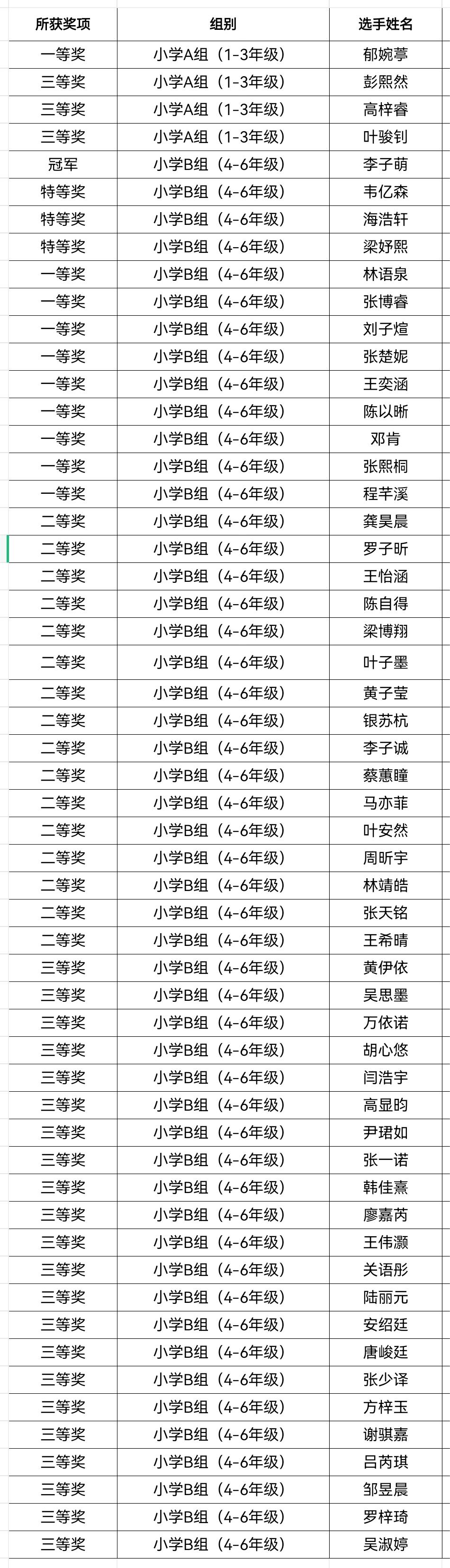 五年级2班的李子萌同学获得省赛小高组的冠军。