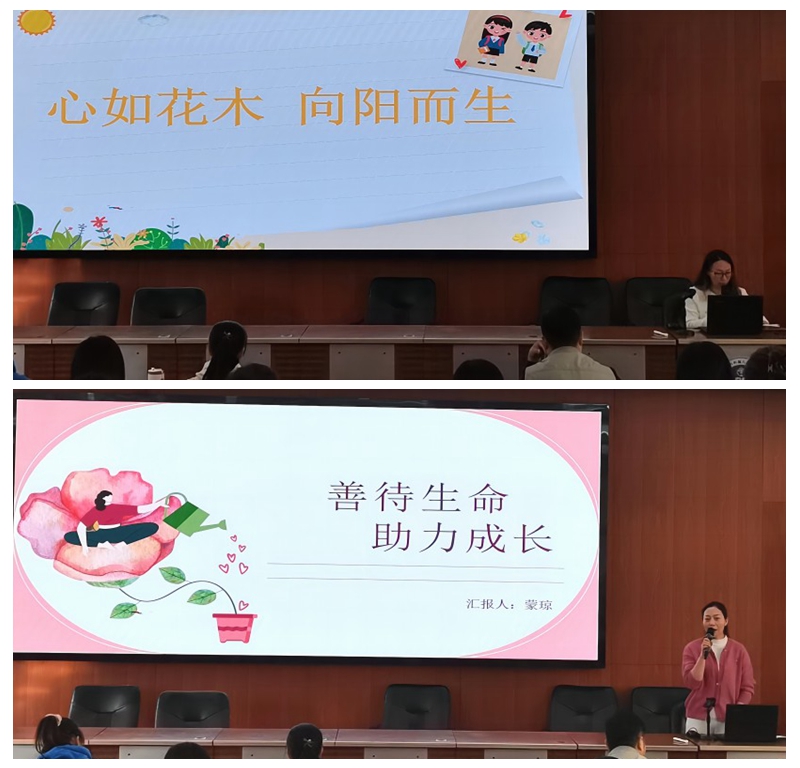 四年级的潘颖老师则分享了“心如花木,向阳而生”的话题。潘老师在日常的带班过程中让孩子了解生命的真谛、认识生命的脆弱与渺小、学会对自己的生命负责,帮助学生正确对待生命,促进孩子们的心理健康。潘老师分享了如何以“心如花木,向阳而生”的心态来培养孩子们积极向上。