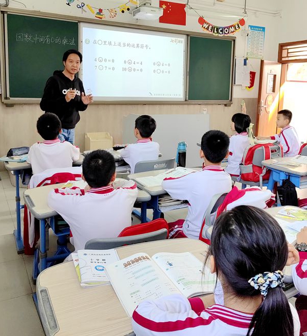 万敏老师一贯幽默风趣的课堂,总是能够吸引孩子们的注意力。在执教《因数中间有0的乘法》一课中,万老师特别关注学生的知识基础,利用迁移学习新知识。万老师在教学0做因数的乘法性质时,引导学生们主动去思考:“2+2+2+2+2+2+2+2=14,乘法算式:2×7=14,桃子吃完了,怎么来表示呢?”“如果用乘法算式怎么表示呢?”让学生发现因数0的乘法特点。用604×8的例题亲自示范,让学生加重解题的步骤和列竖式的基本功和小细节。学生板书与教师板演展示,建立正确有效的计算方法,更效率、更快速的了解学习内容。并且在练习中也设置了学生熟知的情景、为学生创设一些具体生动的学习情境,让学生在一种愉悦的氛围中来学习因数中间有0的笔算乘法,接龙口算因数中间有0的乘法,丰富学生的情感体验,培养学生的学习兴趣。加重学生对知识的理解,更是对学生学习的肯定与鼓励,内容紧凑,条理清晰。