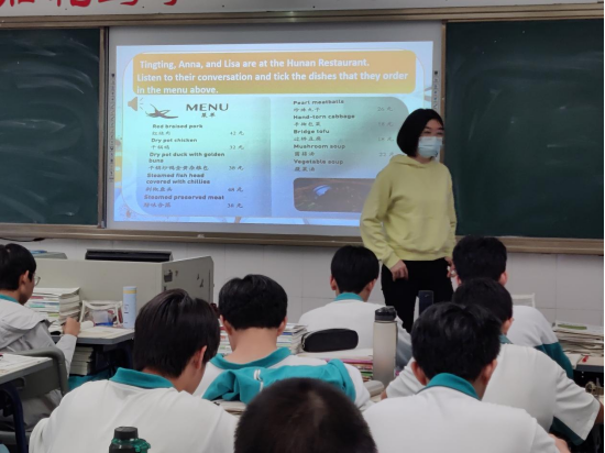 苗老师的研讨课是一堂“听说课”。立足于“人与社会”这个主题语境,着力于培养学生的文化意识和思维品质,这堂“听说课”主要围绕“介绍中国传统饮食文化”,用英语向世界介绍中国菜的制作、风味,和它的文化内涵。这堂课也同样立足于高考,回归到高考,用高考听说考试“CELST”Part B的三问五答形式改编听力材料,力求课堂有趣有料又有用。