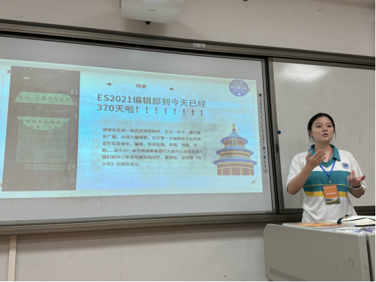 发布会开始,主编刘粤一同学上台发言.粤一同学大概回顾了网课期间的每一次会议,展示了一张张编辑们催稿的截图,介绍了封面和封底的设计。在粤一同学的发言中感受到了诸多困难……但编辑部的少年们,在恰少年的时代,逆流而上,解决问题,卓越完成任务。