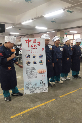 评委席上评委们认真地观看孩子们的展示、演讲,不时给孩子们点头微笑和掌声。小组介绍环节结束就开始包饺子展示真功夫了。