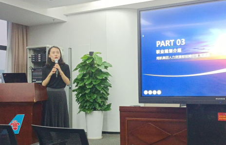 了解完英语的应用,紧接着南航集团人力资源部招聘经理周俊豪先生为大家进行了有关职业规划和南航招聘工作的相关介绍。通过介绍,同学们对自己的未来职业规划有了更清晰的认知,对南航的招聘专业、岗位设置、招聘方式等等都有了更深层次的了解。介绍结束后,同学们积极踊跃地提问发言,提前咨询关于职场的各种疑问。