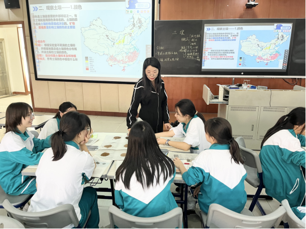 地理组张晓茹老师在高一创实1班授课,课题为《土壤》。张老师创设一境到底的情景,采用问题式探究的方法,以构建学生的思维链条。以“了解不一样的广实外校——土壤”为活动情境,观看校内土壤采样视频导入新课,激发了学生的学习兴趣。采用讲授法、实验法、合作探究法,学生以小组围桌的形式合作学习,分析土壤的主要成分、颜色、质地差异等,教师引导学生通过实验现象得出结论,培养学生的观察能力、动手实践能力、分析问题的能力以及知识总结的能力。课堂生动有趣,活动环节有条不紊,充分调动了学生的积极性和参与度。