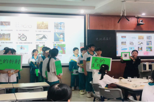 理科专场率先出场的是物理组刘晓青老师。刘晓青的学科素养深厚,专业水平过硬,一直潜心钻研高效乐学课堂。本节课中,刘晓青老师把中考考点《光的折射和反射》巧妙的设计成三个环节,创设生动有趣的站队活动中,让学生深刻理解光的相关知识点,学生们热情高涨、积极参与。在作图环节,刘老师细致引导学生养成良好的答题规范。整节课设计调理清晰,环环相扣,,能有效帮助学生们进行关联知识结构的建立。课堂讲练结合,内容紧贴考点考纲,符合学生们当前阶段的认知水平,获得了良好的复习效果。