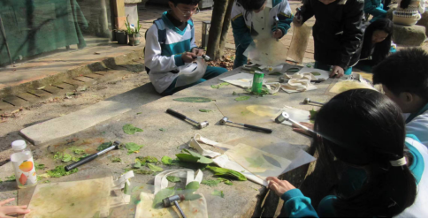 愉快美好的上午马上就过去了,吃过中午饭后,我们便前往做了植物拓染和香囊。“砰砰砰砰砰砰”不断的打击声传来了耳边,同学们卖力的敲打着手上的树叶,虽然手很酸很累,但是心情却无比的愉悦。在天空,似乎每一朵云都在为我们激动;在土地,似乎每一朵花都在为我们的幸福而绽放。最后,同学们都做出来了让自己满意的作品。