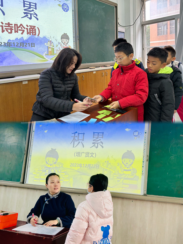 被点到名的孩子自信满满地走上台,抽取所需要背诵的内容,便开始响亮而流利地背诵了,一字一句铿锵有力,每日的诵读积累都化成脑海里最深刻的记忆,在此刻迸发而出。有的孩子有些紧张,支支吾吾地卡住了,测评老师们便用鼓励的眼光注视着他们:“放轻松,你可以的!”孩子们快速回忆着,思索着,突然,脑中灵光一闪,记起来了!于是重新流利地背诵了一遍,眉头舒展了,紧握的小拳头松开了,脸上重新浮现出笑容。