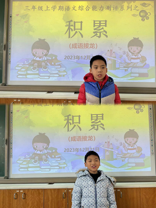 不少孩子一看到古诗的标题,便能流利地背诵出作者、朝代和全文。增广贤文与日积月累的背诵也是对答如流,有的孩子只需给第一个字便能利落地背出全句。成语接龙更不必说,平时的积累加上妙趣横生的成语大会大比拼,孩子们对成语的积累与运用已更上一层楼。本以为必备课文是本次测评活动难度稍大的“拦路虎”,没想到孩子们一个个化身经验十足的“打虎将”,基本都做到了一字不差,可见平时学习之用功。