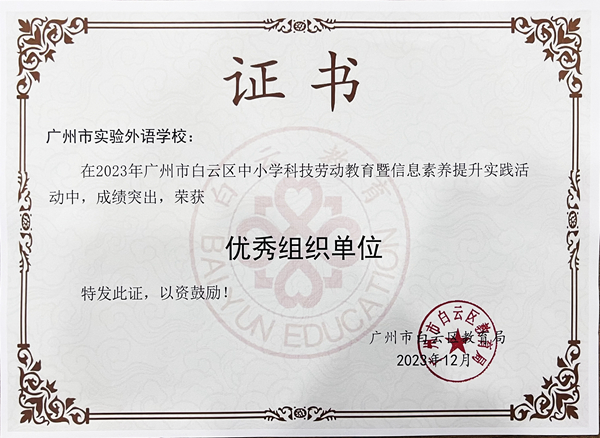 1月18日,在广州市白云区中小学科技劳动教育暨信息素养提升实践活动表彰中,我校荣获优秀组织单位称号,执行校长熊士军出席颁奖典礼。
