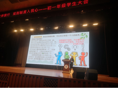 3月19日晚上,广州市实验外语学校初一年级在黄华楼召开“文明礼仪伴我行,规则制度入我心”的主题讲座。优秀班主任向燕萍老师和杨爱娣老师分别从 “教养”与“规则”两方面做了分享。