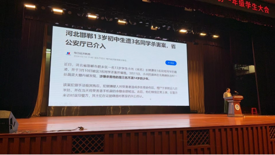 最后,年级长龚主任通过邯郸初中生杀害同学的案例,分析了生活中要做到与人为善。心怀善意对待同学,对待老师,对待父母,对待周围的人!《未成年人保护法》保护未成年人,但不该保护未成年人犯法!《未成年人保护法》不是未成年人的“免死”金牌!