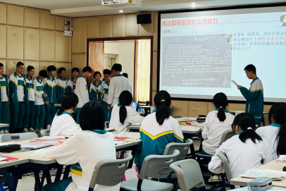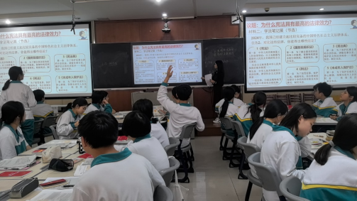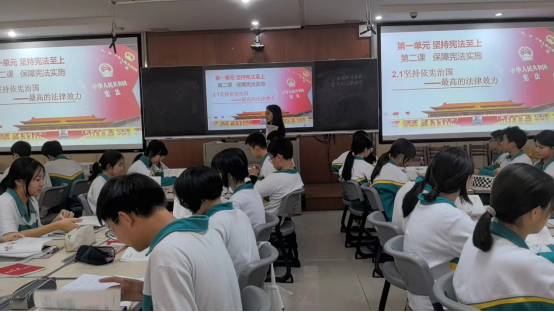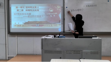 初二道德与法治下册又称“宪法”专册,知识性比较强,法律方面的专有名词较多,学生接受起来有一定困难,所以有针对性的选课题、选授课班级非常重要。在时间比较紧的情况下,初二备课组团结协作,认真分析学情、教材情况,最终选定以第二课第一课时“坚持依宪治国”为示范课课题,十一班作为教学班。