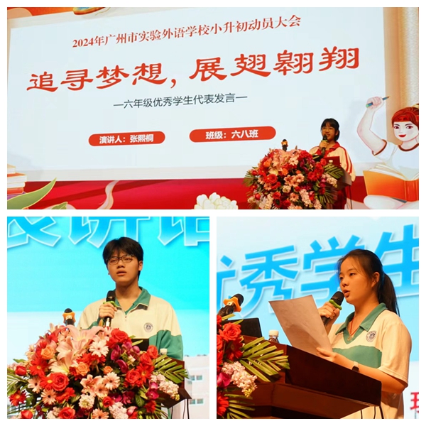 来自六(8)班的张熙桐同学,落落大方地为同学们分享了她的学习心得。她认为在广外外校,同学们不仅学会了一笔好字,一副好口才,一门流利的外语,一手好文章,更成长为一个有责任感和有爱心的人。小升初是一个重要的转折点,同学们需要一双强有力的翅膀,展翅飞向广阔的蓝天。而这双羽翼就是明确的学习目标、良好的学习心态、高效的学习方法、强健的身体素质。张熙桐同学以自己的常规学习状态和具体做法来告诉每一位同学, “坚其志,苦其心,勤其力,事无大小,必有所成。”!