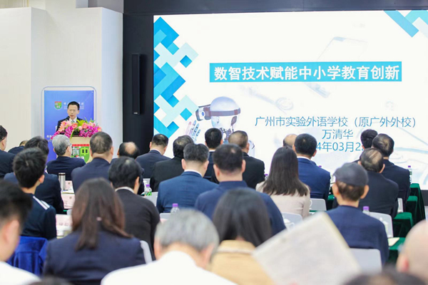 会上,万清华校长分享了数智技术在中小学教育创新中的应用和未来展望,特别强调了人工智能(AI)技术在教学中的重要性。他以广州市实验外语学校为例,介绍了学校如何利用数字技术进行教育创新,以及智能系统在外语学习、个性化学习平台、虚拟教学、智慧体育等方面的应用。