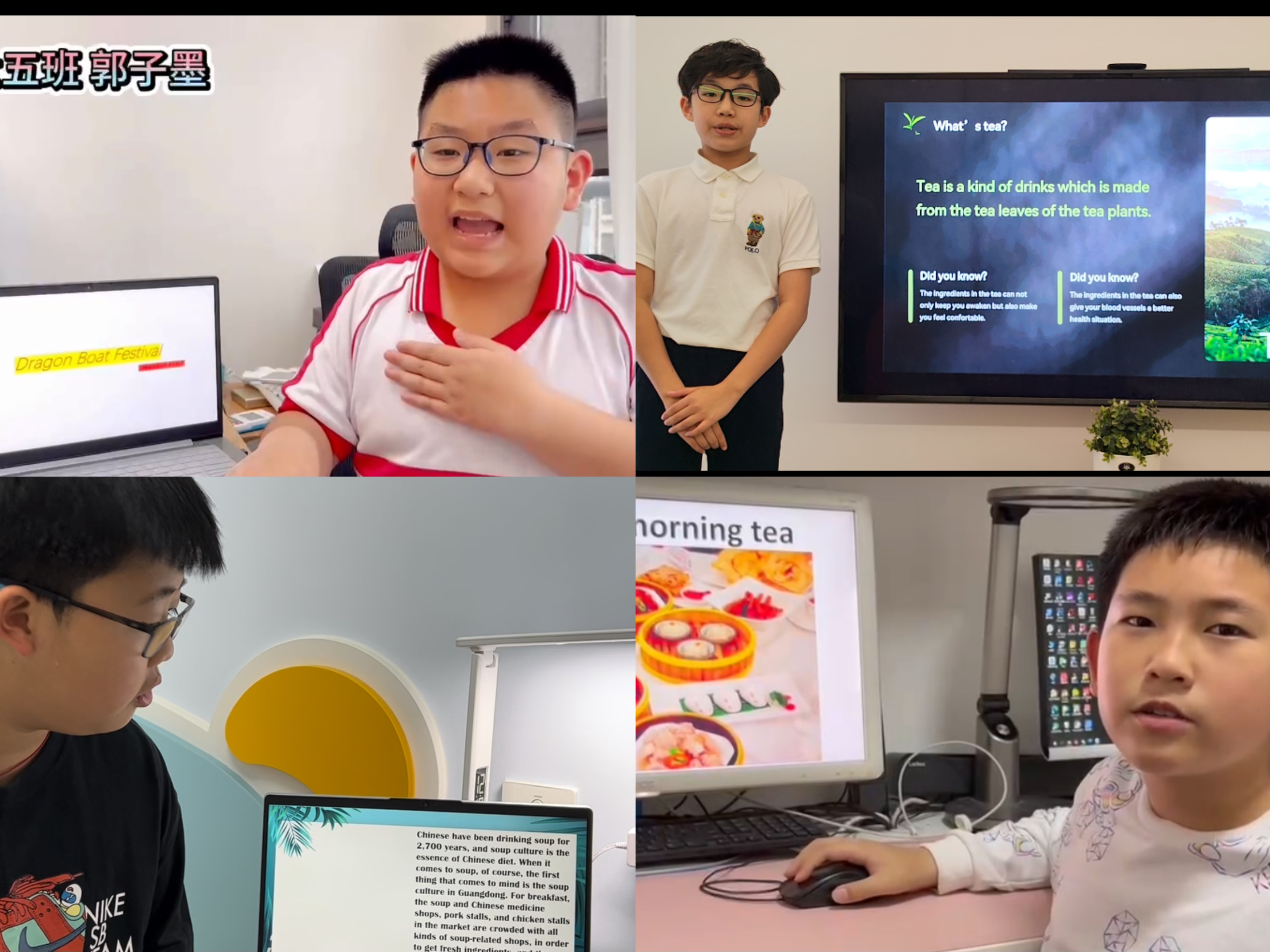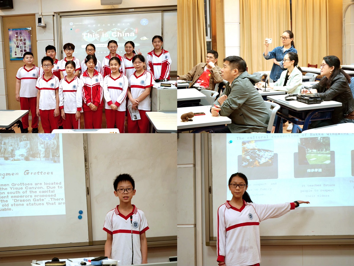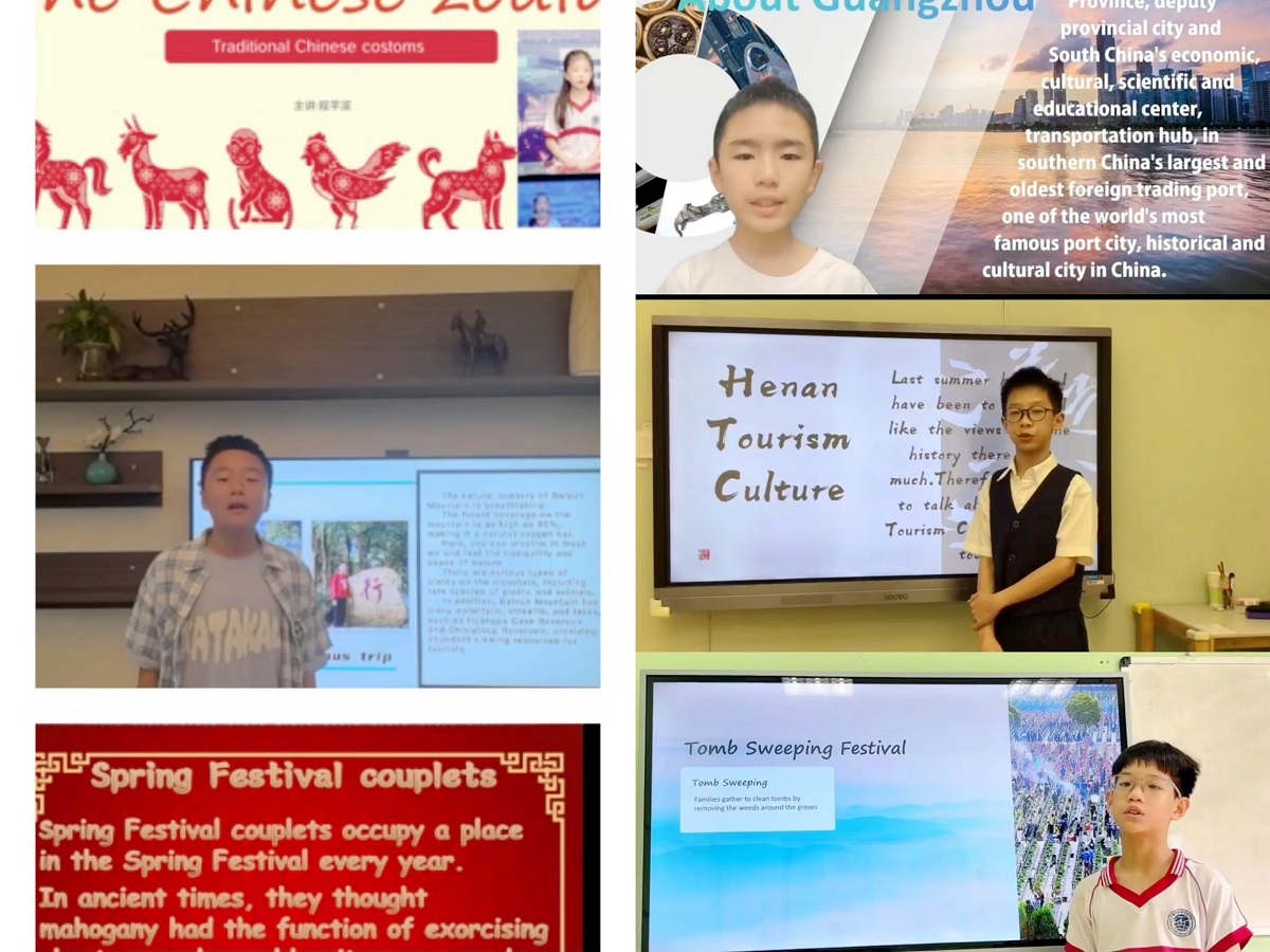 孩子们在清明假期,都认真收集资料,自己动手写英文介绍,然后制作精美的PPT,在每个班级,都能发现很多制作精美的介绍中国文化的作品,有介绍中国节日的,中国24节气的,还有关于广州美食以及介绍广州这座古老的城市的,甚至还有关于鄱阳湖、河南等著名景点的介绍等等,真是分门别类,丰富多彩。由此不难看出孩子们对于这个活动的喜爱以及广外孩子突出的语言能力与实践能力。看,孩子们在镜头前侃侃而谈多么自信。