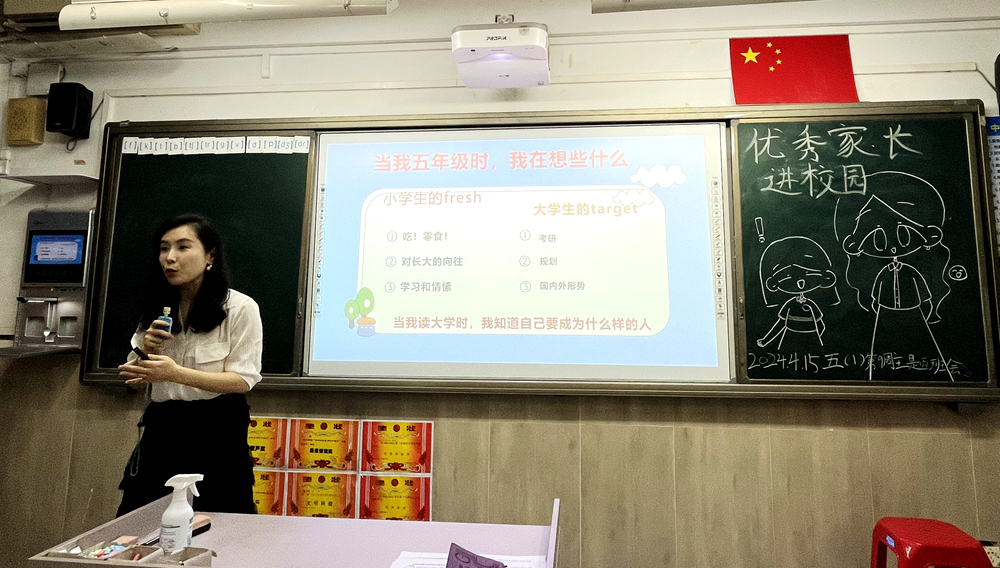 在活动的互动环节中,晓晓妈妈与班级学生进行探讨,随机问答,进行了深入的交流。她耐心地回答了孩子们关于如何处理梦想与现实的关系、如何解决学习困境与目标的实现等难题。她的经验和见解让在场的每一位孩子都受益匪浅。