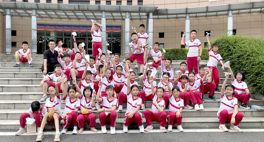 活动前,科学老师首先给同学们布置好任务,让同学们回家练习纸飞机的制作,探究什么样的纸飞机滞空时间长?活动中,孩子们首先在课堂上按照自己的探究,折叠出形状各异的纸飞机,然后外出放飞。你可以看到,在黄华楼礼堂前,在假草坪上,都有孩子们放飞纸飞机的身影。这时的孩子们,忘却了一切,满眼都是纸飞机,活动中,到处都是欢声笑语,到处都是追逐“飞机”的身影。古人所描述的“儿童散学归来早,忙趁东风放纸鸢”,大概就是这个景象吧。有的同学纸飞机10多秒以上,兴高采烈,有的同学的纸飞机一出手就落下了地,但也没有表现沮丧,当场就在旁边改进,再飞行再改进……最终成功飞向“蓝天 ”。