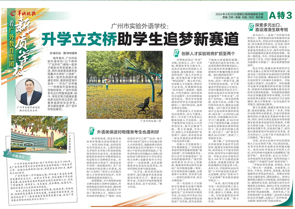每年春天,广州市实验外语学校(以下简称“广实外校”)都有一批学子提前半年告别高三生活,因外语类保送拿到全国重点大学的“入场券”,也有一批学生因国外直通车项目,提前锁定海外名校……作为广州市唯一拥有外语类保送资格的学校,广实外校因多元出口而备受追捧,如今,学校正努力搭建起更加多元的升学立交桥,把更多选择权交还学生。多元路径逐梦,在广实外校愈加真切。