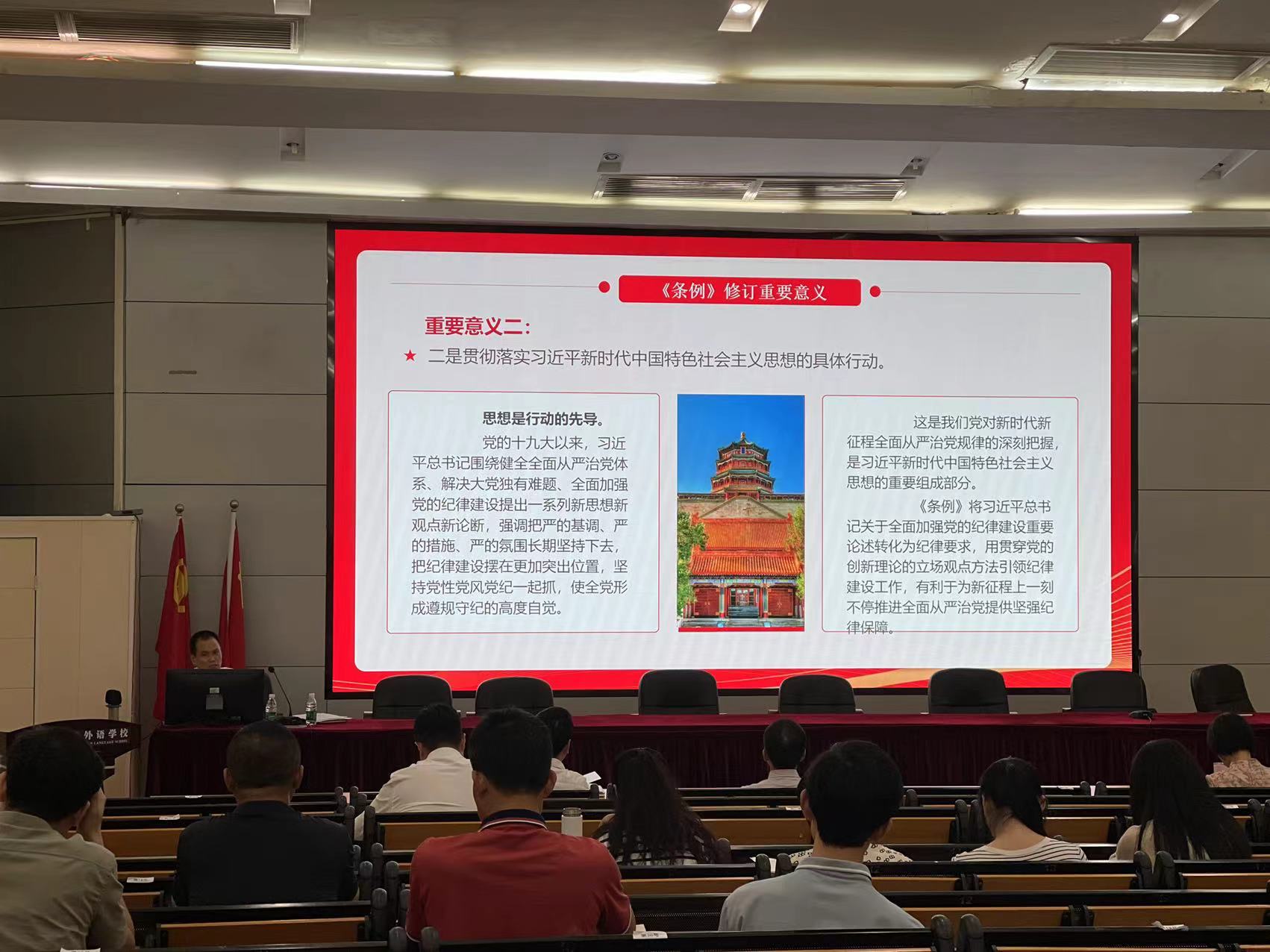 最后,魏传文书记要求全校广大党员干部:一是要在服务党和国家大局中学习领会《条例》的主旨要义;二是要加强党纪教育,增强遵规守纪自觉;三是要敢于善于斗争,严格精准执纪。要增强贯彻执行新《条例》的自觉性和坚定性,自觉将纪律要求内化于心、外化于行,确保目标一致、团结一致、步调一致,努力营造风清气正的校园政治生态,为学校改革发展提供坚强的政治保证。