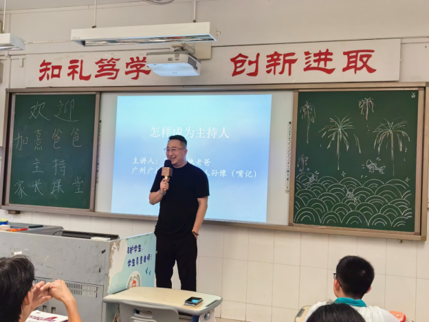 5月19日,周日晚上,我们初二(3)班举办了一场别开生面的家长课堂,这次可是有大咖来啦!是的,他就是我们班孙加熹同学的家长——广州广播电视台主持人嘴记(孙豫)老师!