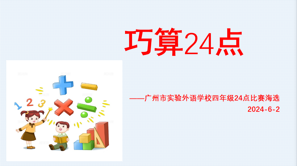 24点是一种有趣的数学游戏,它以独特的游戏力和丰富的数学内涵被学生所喜爱。为了丰富校园生活,提高计算能力。2024年6月2日晚上,小学部四年级数学组开展了24点速算游戏活动的海选。